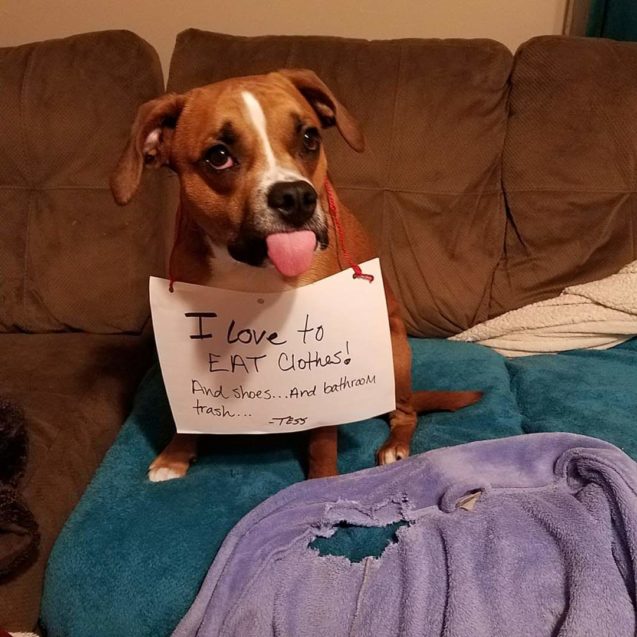 I love to eat clothes, shoes and bathroom trash!The post I love to eat clothes! appeared first on Dogshaming.